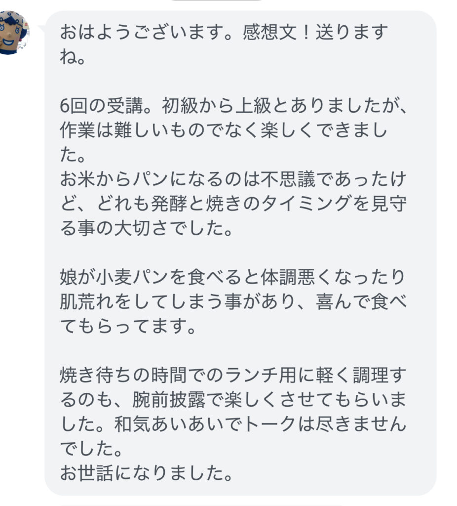 生米型食パン講座 ラスト上級を終えての感想を頂戴いたしました。